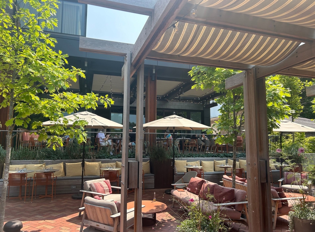 Fantastic experience: We didn't stay at the hotel but went there for dinner on their covered patio. The food is Fantastic! The burger, green salad, mushroom pasta, and steak frites were delicious. The service was also super good. We will be back! Oh, and they served our dog, too :)
